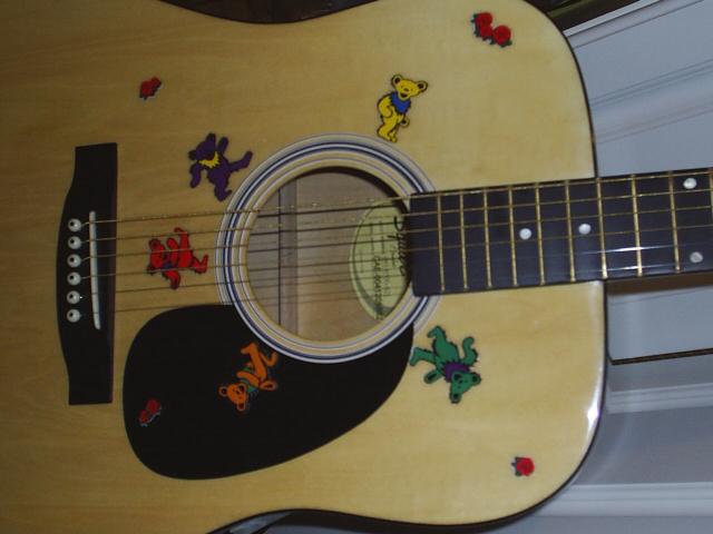 My acoustic guitar with some Grateful Dead stickers on it.