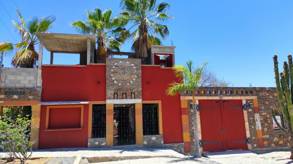 Colorful walls contrast well with the azul sky of the mountains in Baja California Sur.